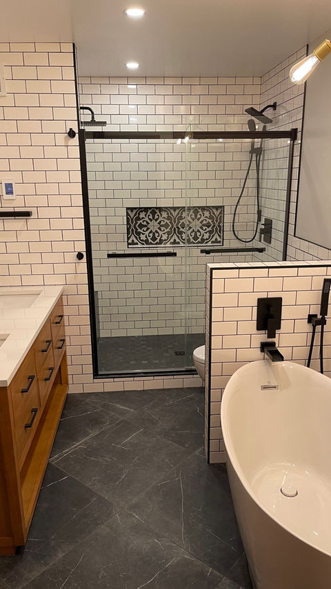 This bathroom took the word dated to another level. These clients wanted to open up and increase floor space. We removed a closet and wall along with relocating plumbing to add both a shower and free standing tub. The custom shower features two shower heads and a built in bench. The clients now say they love their bathroom more than a hotel bathroom.