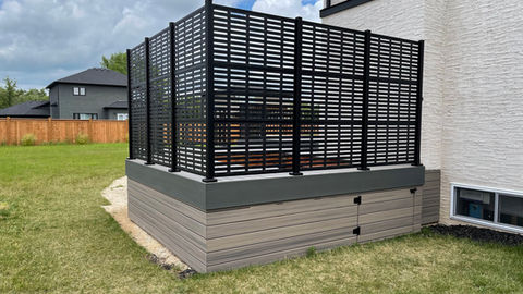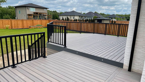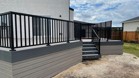 These clients wanted to expand their living space into their backyard. This deck features 10.5ft screw pile foundation, 10" pressure treated beams/joists, composite decking/skirting with access, aluminum railing, aluminum privacy walls, stair lighting and hot tub.